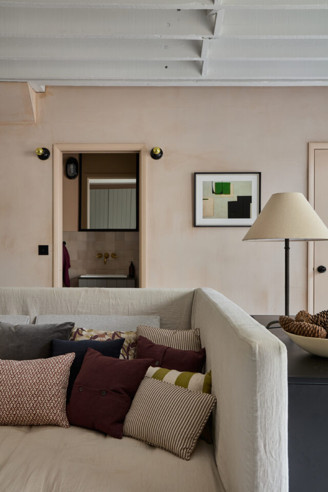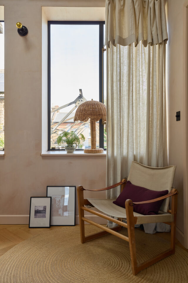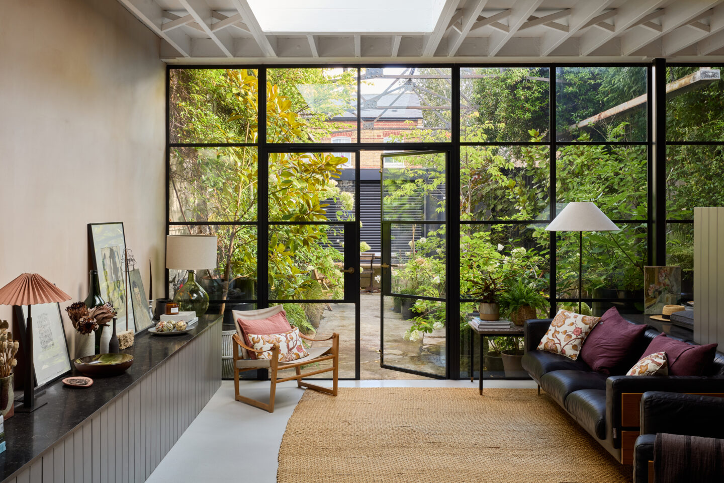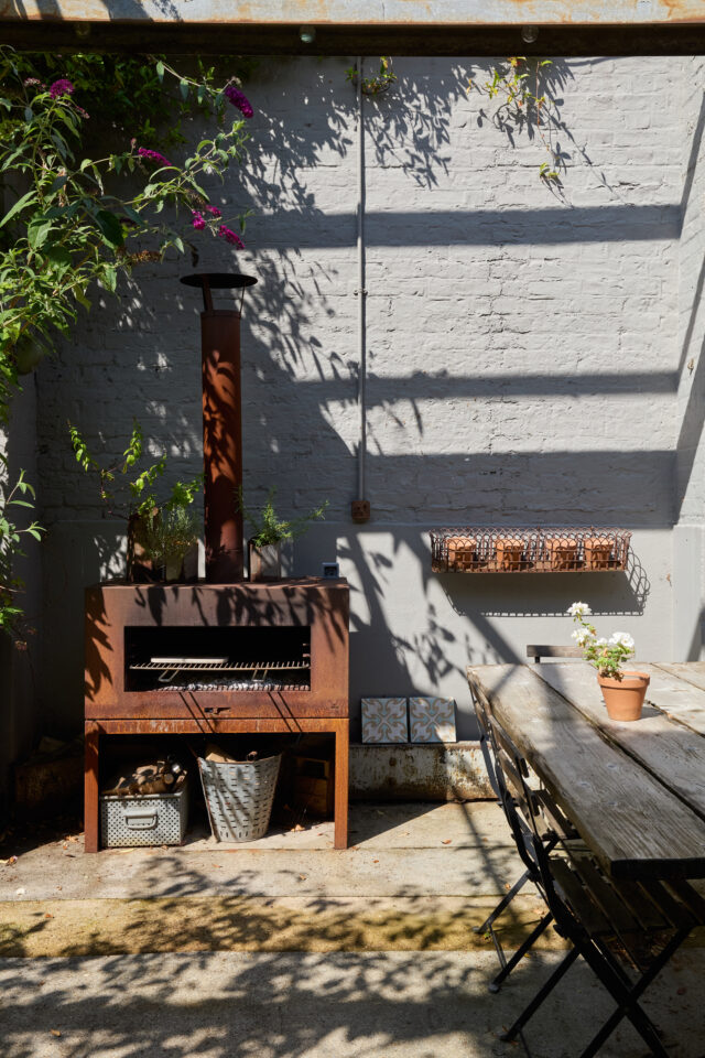This crumbling Victorian Dairy had a collapsing roof, damp and no natural daylight before it was restored by Imperfect Interiors. The previously dark, dank spaces were converted into a light-filled family home but retained their industrial atmosphere and unique character, whilst the extensive use of steel windows and doors maximised the views of the 2 vertical courtyard gardens. A limited palette of materials including unlacquered brass, plaster and concrete put an elegant twist on the previously industrial aesthetic.