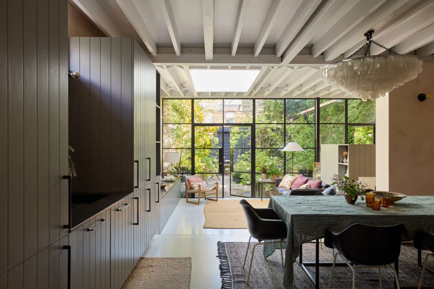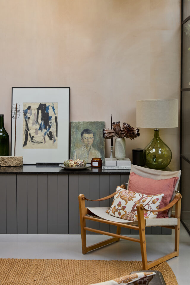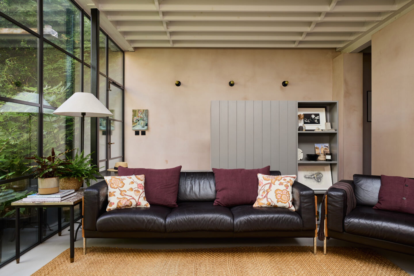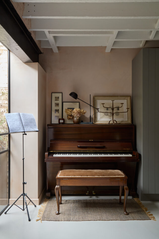This crumbling Victorian Dairy had a collapsing roof, damp and no natural daylight before it was restored by Imperfect Interiors. The previously dark, dank spaces were converted into a light-filled family home but retained their industrial atmosphere and unique character, whilst the extensive use of steel windows and doors maximised the views of the 2 vertical courtyard gardens. A limited palette of materials including unlacquered brass, plaster and concrete put an elegant twist on the previously industrial aesthetic.