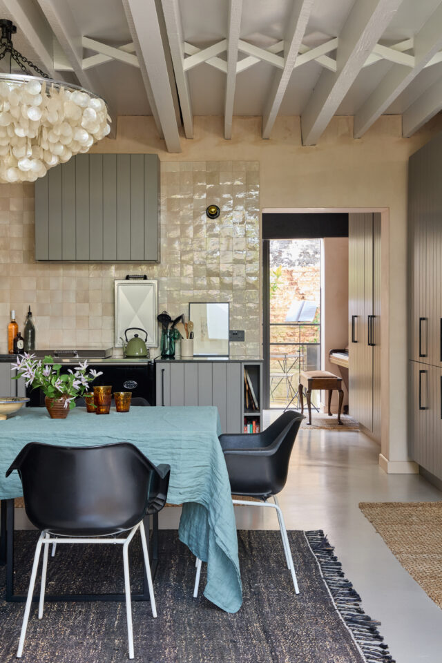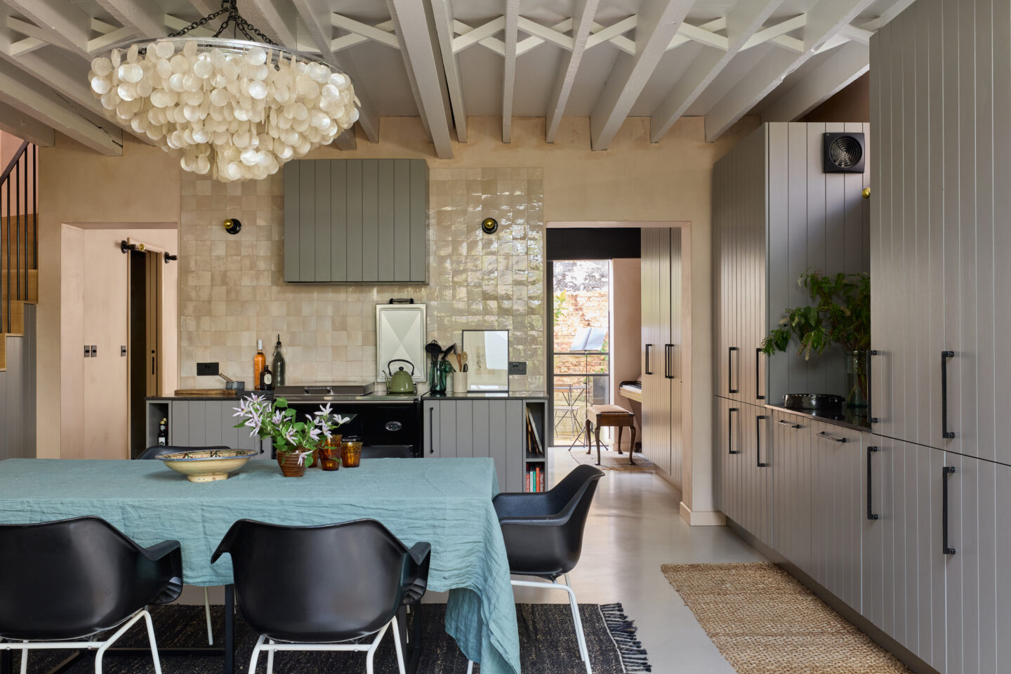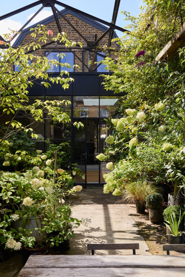 This crumbling Victorian Dairy had a collapsing roof, damp and no natural daylight before it was restored by Imperfect Interiors. The previously dark, dank spaces were converted into a light-filled family home but retained their industrial atmosphere and unique character, whilst the extensive use of steel windows and doors maximised the views of the 2 vertical courtyard gardens. A limited palette of materials including unlacquered brass, plaster and concrete put an elegant twist on the previously industrial aesthetic.
