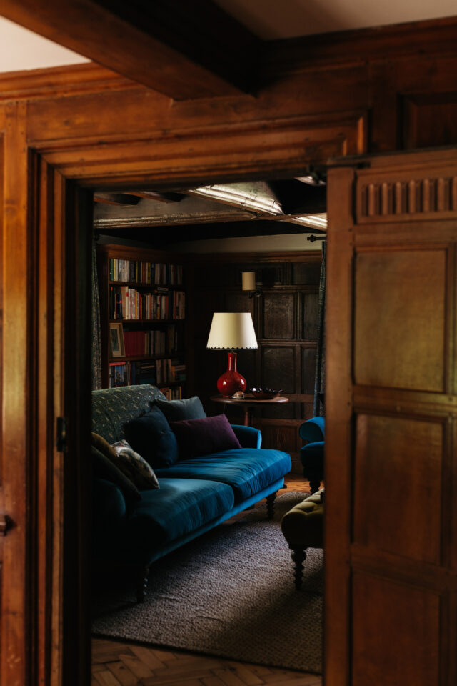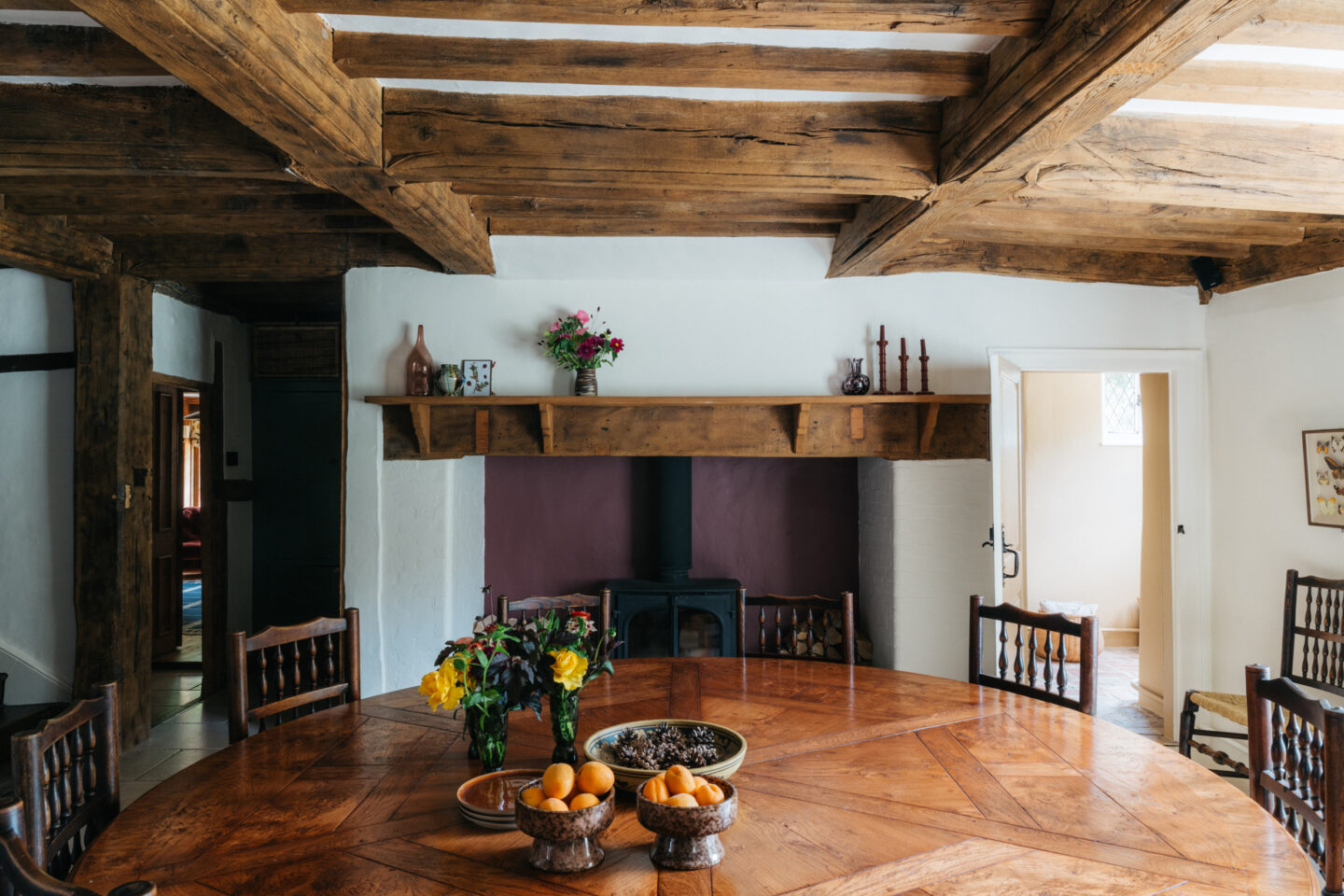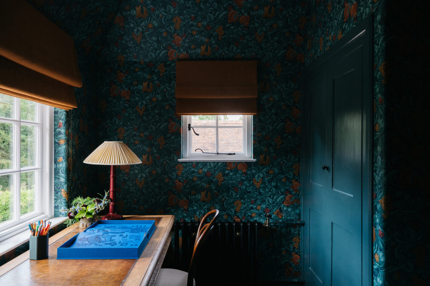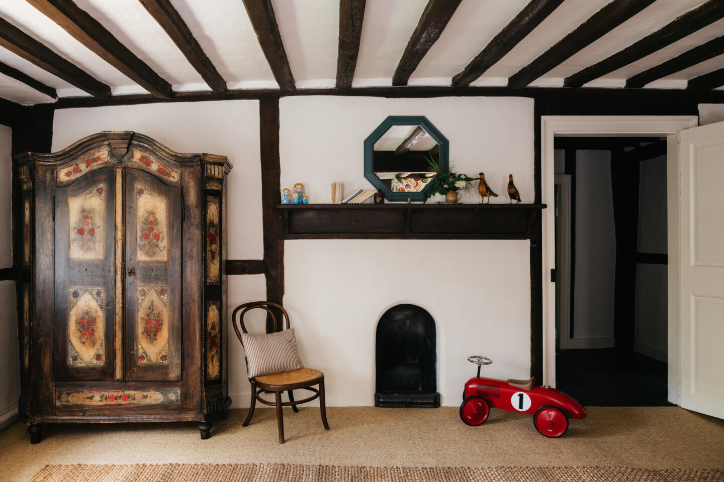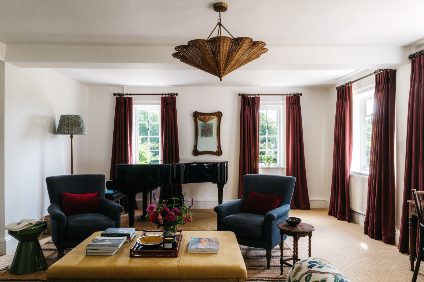 This sprawling Wealden home in the Kent countryside is a mix of several architectural periods, and was rather incoherent when our clients bought it. We warmed it up by adding strong colours, rich patterns and playful elements for the four young children. We then sourced antiques, had bespoke furniture made and added layers of textures and lighting to create atmosphere and warmth for the owners to enjoy with their friends and family